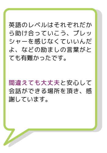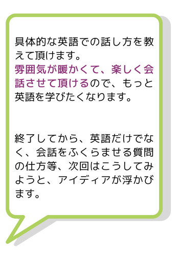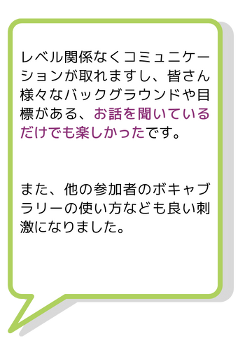 毎月の会話のトピックに対し、使える文法やフレーズ表現を学び、メンバーとすぐに実践練習をしていきます。