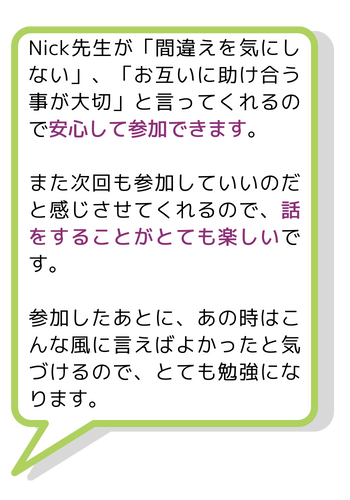 英語ティーチング歴15年以上、イギリス人ネイティブのNick先生のミニレッスンを受けながら、英会話を「練習する」クラブです。